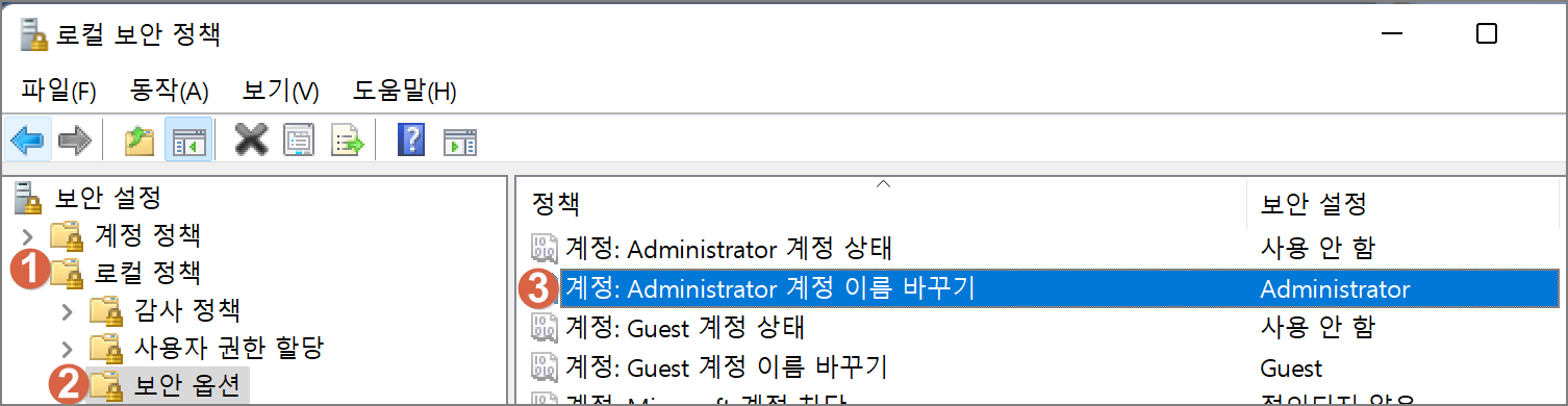 secpol.msc → 로컬 정책 → 보안 옵션 → Administrator 계정 이름 바꾸기