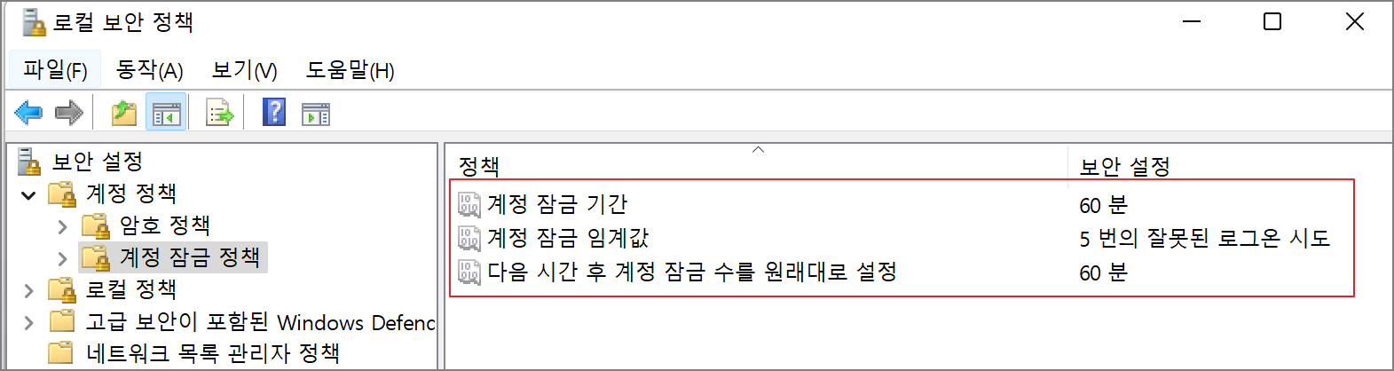 계정 잠금 기간: 60분