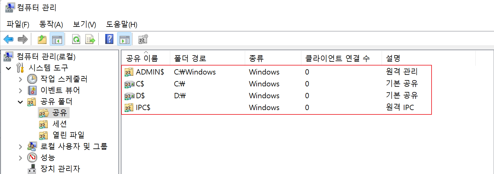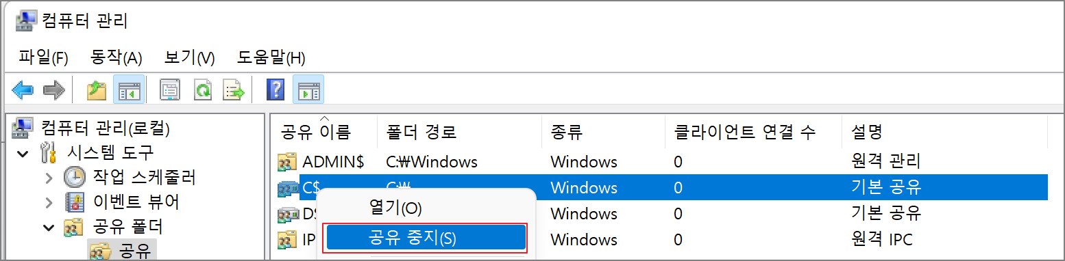 윈도우 설치 시 하드디스크 기본 공유, 원격 관리 및 IPC용 기본 공유가 설정되어있다.