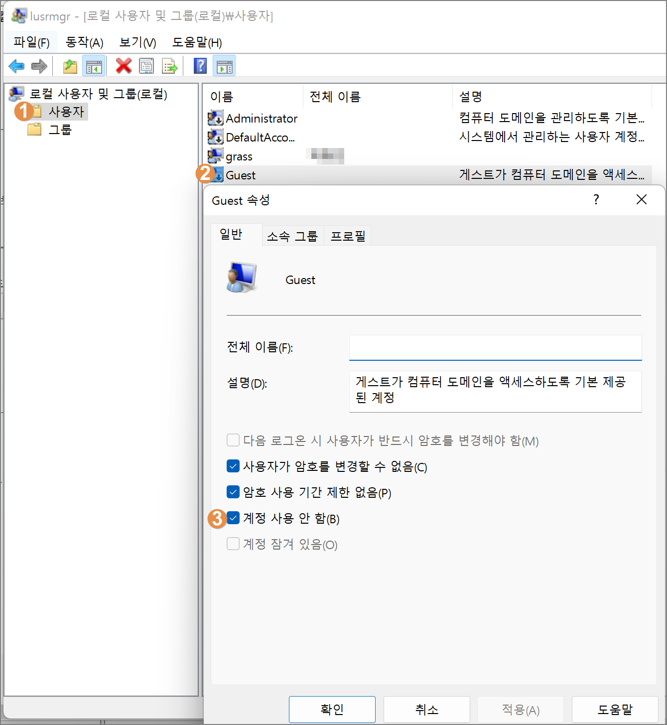 lusrmgr.msc → 로컬 사용자 및 그룹 → 사용자 → Guest → 계정 사용 안함