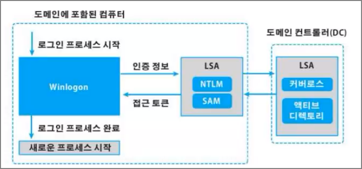 로그인 후 LSA 서브 시스템이 로컬 또는 도메인 인증용인지 확인 한 후 커버로스 프로토콜에 의해 도메인 컨트롤러에 인증을 요청한다.