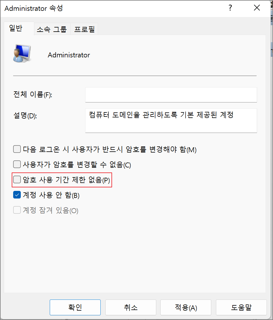 패스워드 사용기간을 설정했더라도 계정 속성에서 암호 사용 기간 제한 없음이 체크되어 있다면 적용되지 않기 때문에 반드시 체크 해제한다.