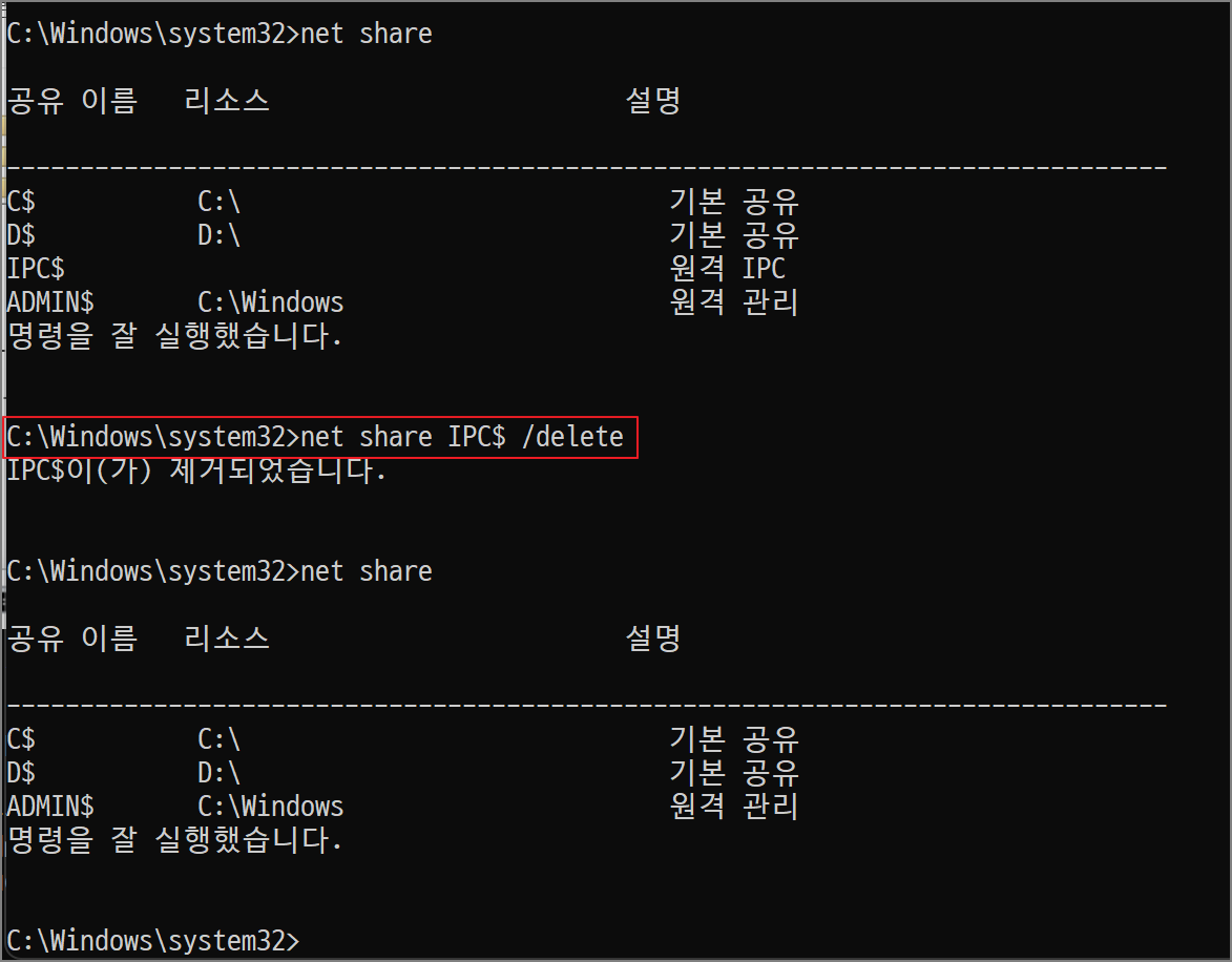 cmd에서 net share [공유 경로] /delete 입력