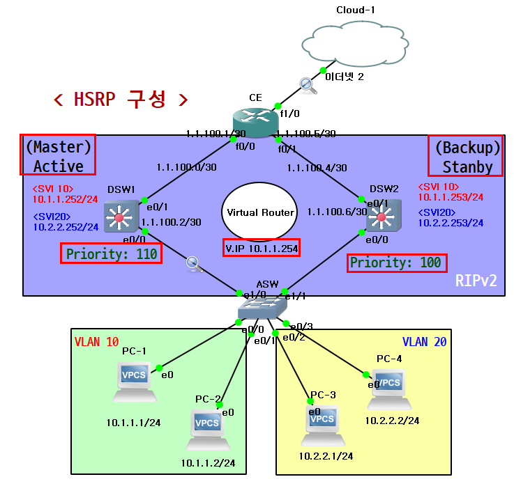 1) HSRP Priority 값이 높은 장비가 Active로 선출. (Default: 100, Max: 255)