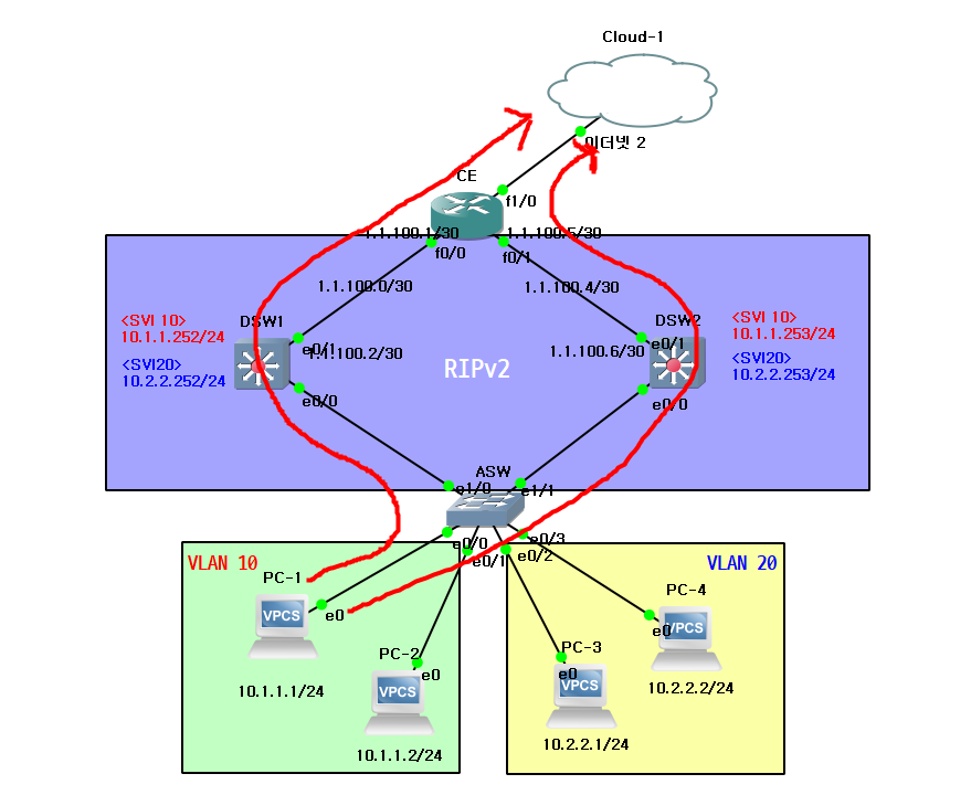 - 이중화하기 전 VLAN 10번의 Gateway는 DSW1이고 VLAN 20번의 Gateway는 DSW2이다.