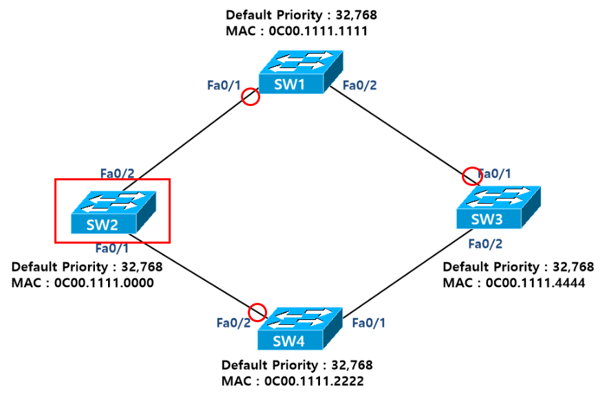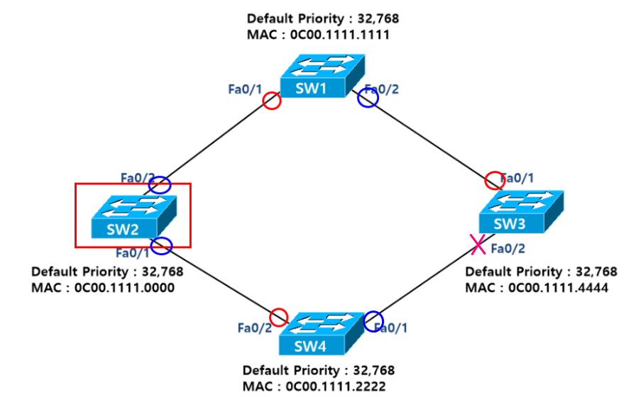 - Root Switch 는 Bridge ID가 가장작은 SW2 가 된다. (Priorty값은 동일 Mac Address는 SW2가 가장 작다)