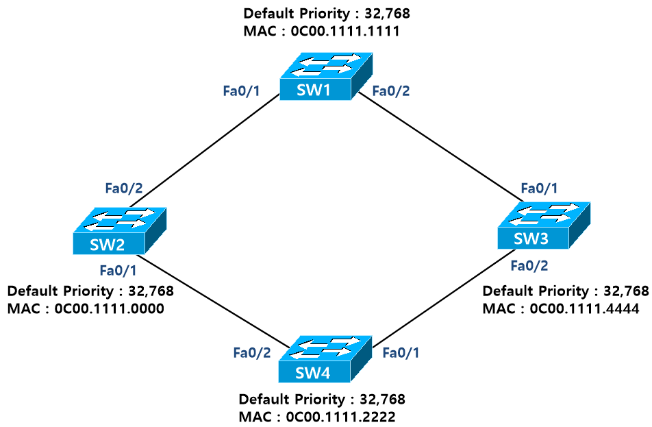 - SW3에서 SW2로 가는 경로는 둘 다 같으므로 Bridge ID'가 가장 낮은 포트인 Fa0/1이 Root Port가 된다. (SW1(Fa0/1): 1111 > SW4(Fa0/2): 2222)