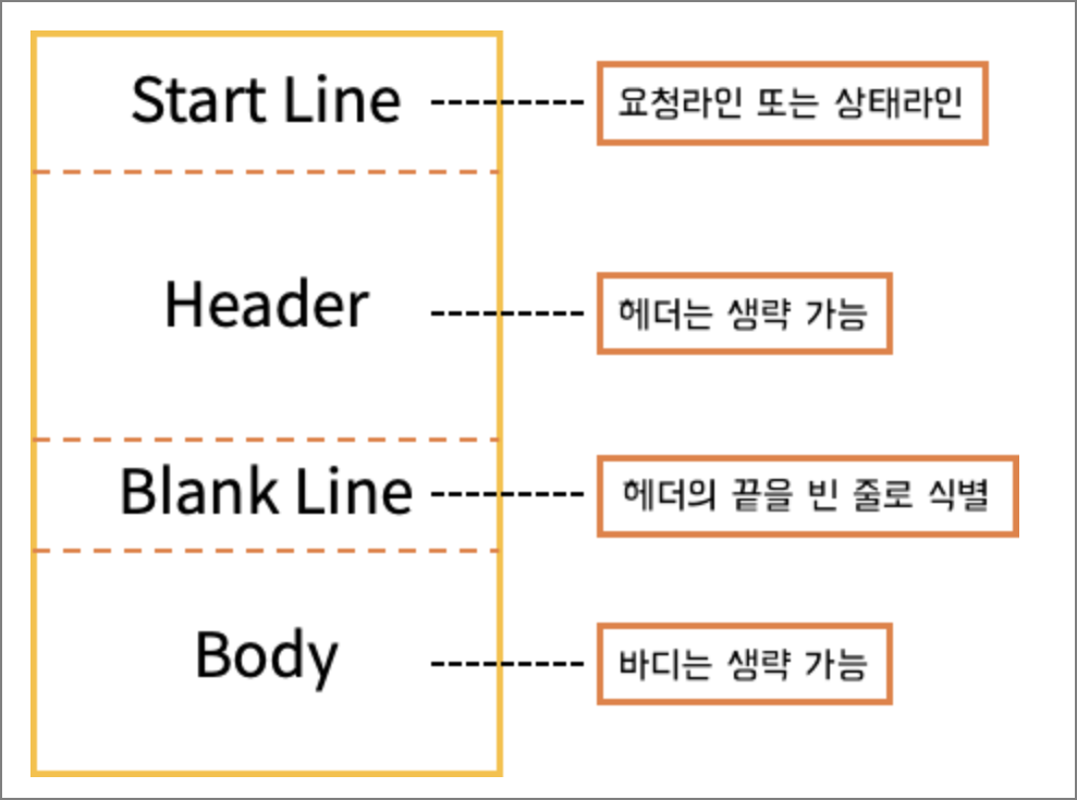 Start Line: 요청 메소드<공백>요청 URL<공백>HTTP버전<개행>