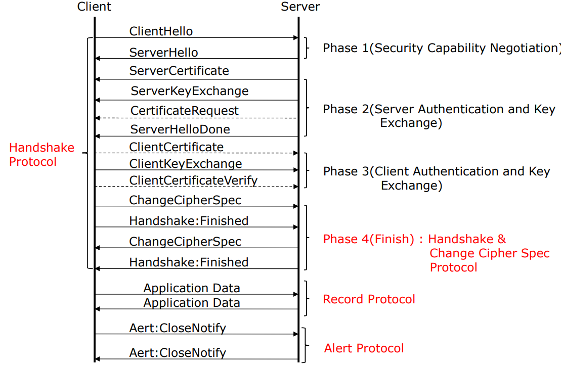 ChangeCipherSpec: 이 메시지 이후 전송되는 메시지는 새롭게 협상된 알고리즘 과 키를 이용한다는 메시지이다.