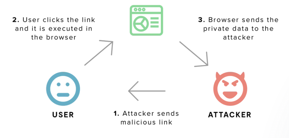 스크립트 코드가 인자 형태로 포함된 URL을 클릭할 때 스크립트 코드가 취약한 웹서버로 전달되고 웹서버의 응답 페이지에서 해당 악성 스크립트가 삽입되어 희생자 측에서 동작하는방식
