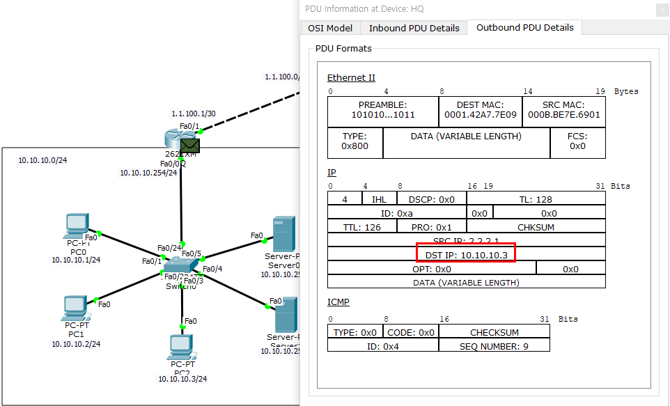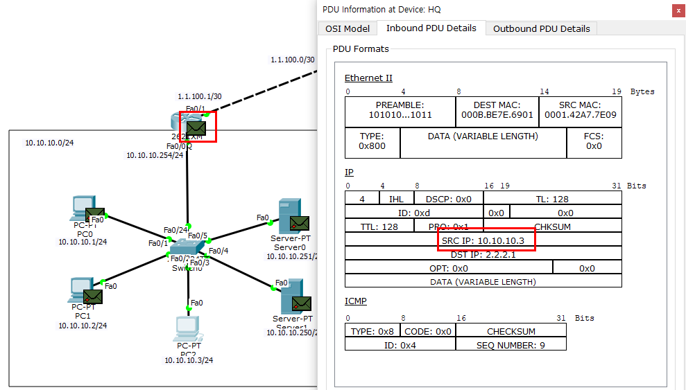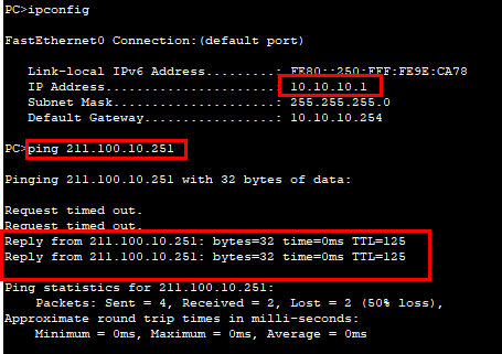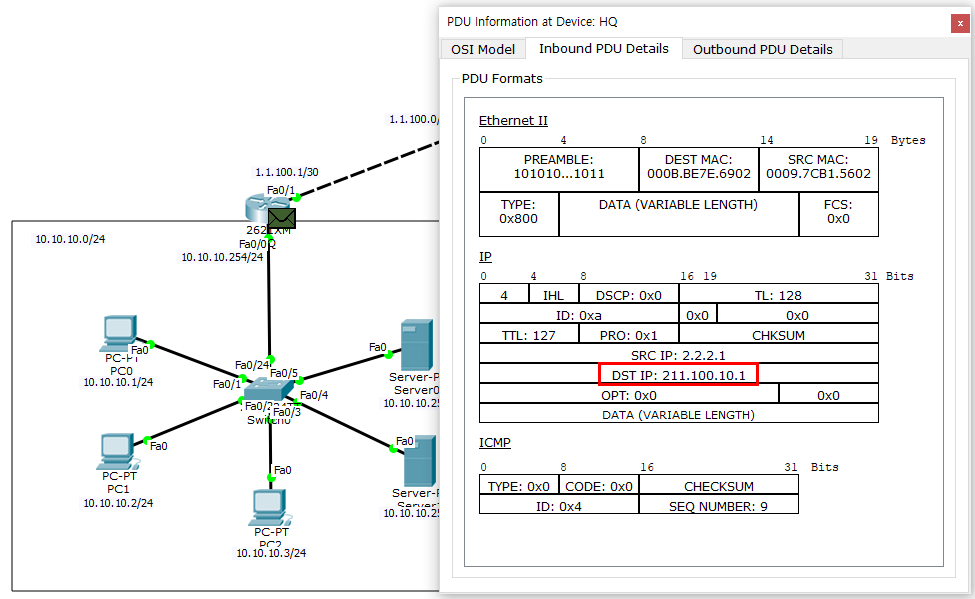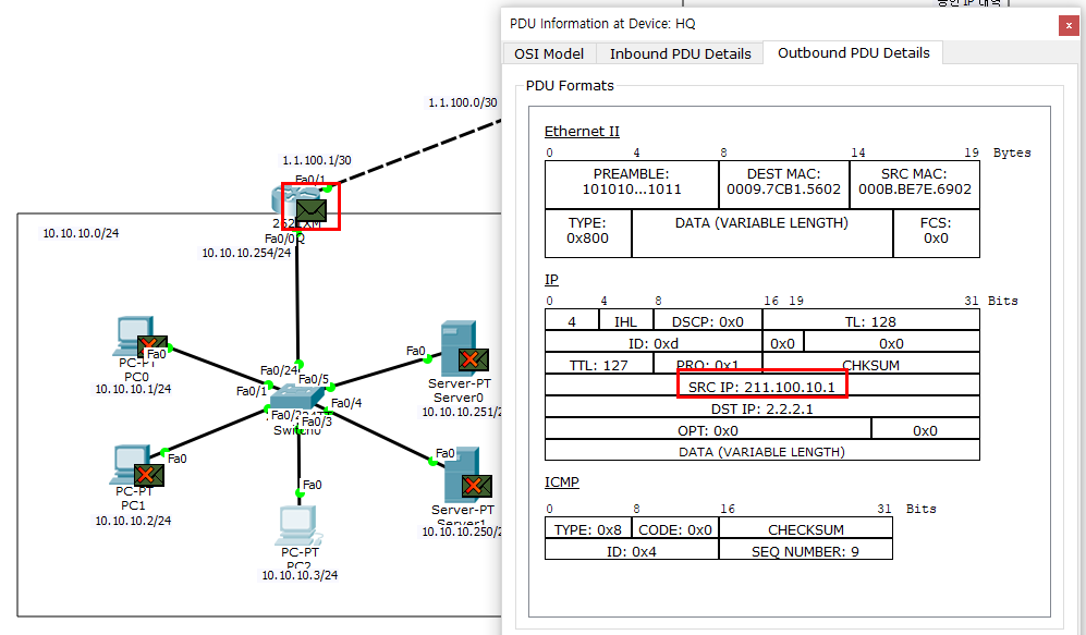 HQ(config)#ip nat inside source static 10.10.10.250 211.100.10.250 HQ(config)#ip nat inside source static 10.10.10.251 211.100.10.251 |