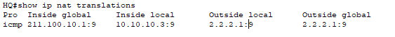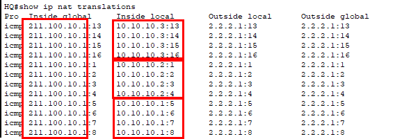 HQ(config)#do show ip nat translations Pro Inside global Inside local Outside local Outside global --- 211.100.10.250 10.10.10.250 --- --- --- 211.100.10.251 10.10.10.251 --- --- |