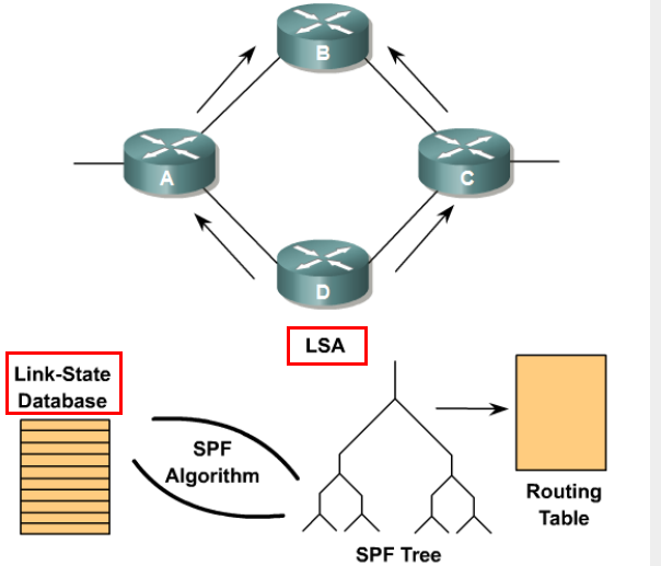 - Link-State 계열의 Routing Protocol이 설정된 라우터들은 자신의 Link(=interface) 상태를(state) LSA라는 정보로 생성하여, 동일 Area에 포함된 모든 라우터들에게 Flooding 한다.