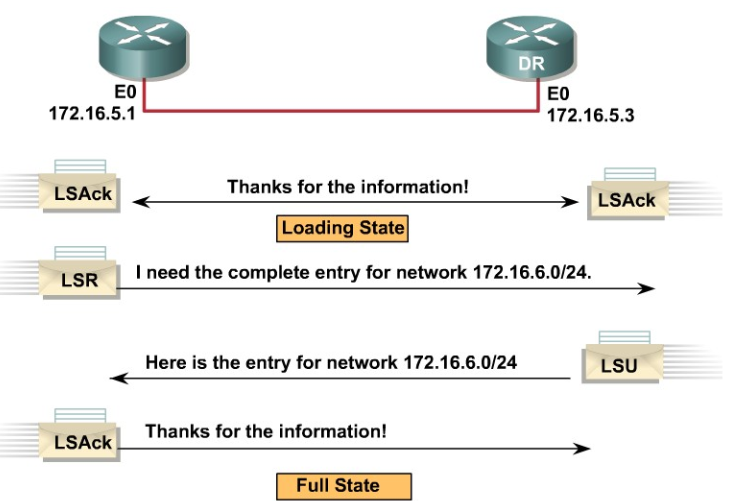 - 상대방 장비로부터 수신한 DBD 정보와 자신의 LSDB의 정보를 비교한 후 자신의 LSDB에 없는 정보가 상대방 장비에게 있다고 확인되면 해당 정보에 대해서 상세한 내용을 부탁해야 한다.