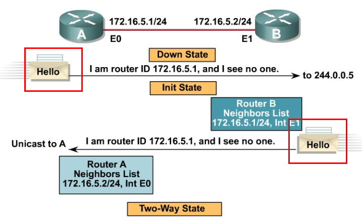 - OSPF의 경우도 5개의 OSPF Packet을 사용하여 Neighbor 관계를 형성하고, 정보(LSA)를 교환할 수 있다.