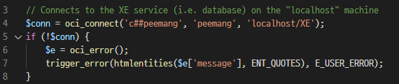 oci_connect 메소드에 이전에 생성한 사용자 ID, 패스워드를 넣는다.
