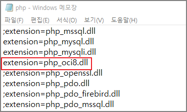 오라클과 php를 연동하기 위해 php.ini파일의 extension=php_oci8.dll 문자 앞에있는 주석을 제거한다.