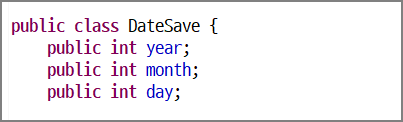 년, 월,일을 저장할 default 접근 제어자가 설정된 멤버 변수를 선언한 후 해당 정보를 출력하는 클래스를 생성하였다.