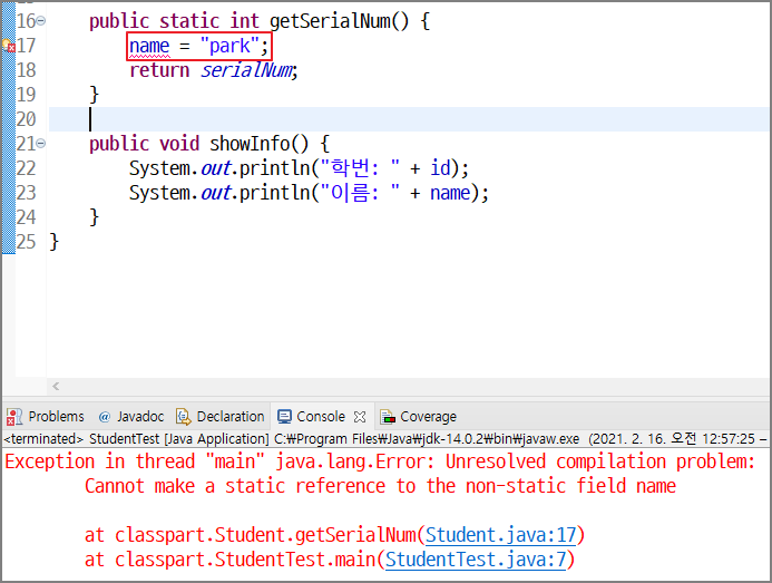 이후 생성자가 호출될 때마다 serialNum 값을 학번에 저장하고 학번 값을 1씩 증가시킨다.