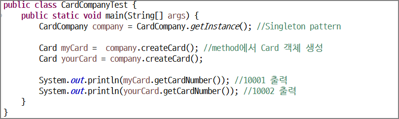 다음 코드가 수행 되도록 Card 클래스와 CardCompany 클래스를 구현하세요