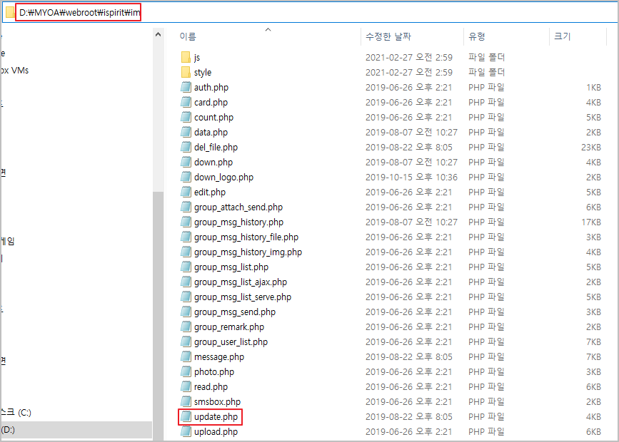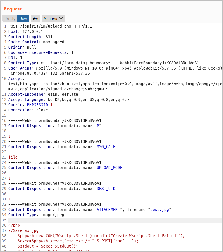 POST 전송을 통해 /ispirit/im/upload.php에 접근한 후 3개의 매개변수 값에 1이 삽입되어 검증을 우회하여 php 구문이 삽입 된 jpg 파일이 업로드 되는것을 확인할 수 있다.