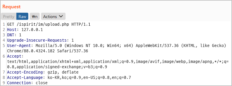 | GET /ispirit/im/upload.php Host: 127.0.0.1 DNT: 1 Upgrade-Insecure-Requests: 1 User-Agent: Mozilla/5.0 (Windows NT 10.0; Win64; x64) AppleWebKit/537.36 (KHTML, like Gecko) Chrome/88.0.4324.182 Safari/537.36 Accept: text/html,application/xhtml+xml,application/xml;q=0.9,image/avif,image/webp,image/apng,*/*;q=0.8,application/signed-exchange;v=b3;q=0.9 Accept-Encoding: gzip, deflate Accept-Language: ko-KR,ko;q=0.9,en-US;q=0.8,en;q=0.7 Connection: close |