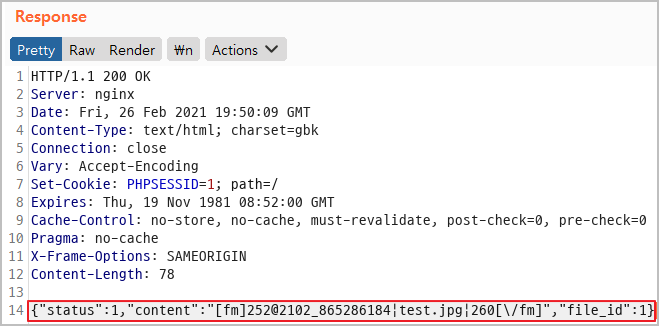| HTTP/1.1 200 OK Server: nginx Date: Fri, 26 Feb 2021 19:50:09 GMT Content-Type: text/html; charset=gbk Connection: close Vary: Accept-Encoding Set-Cookie: PHPSESSID=1; path=/ Expires: Thu, 19 Nov 1981 08:52:00 GMT Cache-Control: no-store, no-cache, must-revalidate, post-check=0, pre-check=0 Pragma: no-cache X-Frame-Options: SAMEORIGIN Content-Length: 78 {"status":1,"content":"[fm]252@2102_865286184|test.jpg|260[\/fm]","file_id":1} |