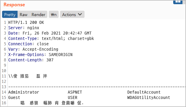 | HTTP/1.1 200 OK Server: nginx Date: Fri, 26 Feb 2021 20:42:47 GMT Content-Type: text/html; charset=gbk Connection: close Vary: Accept-Encoding X-Frame-Options: SAMEORIGIN Content-Length: 307 \\俊 措茄 荤侩磊 拌沥 ------------------------------------------------------------------------------- Administrator ASPNET DefaultAccount Guest USER WDAGUtilityAccount 疙飞捞 窍唱 捞惑狼 坷幅肺 肯丰登菌嚼聪促. |