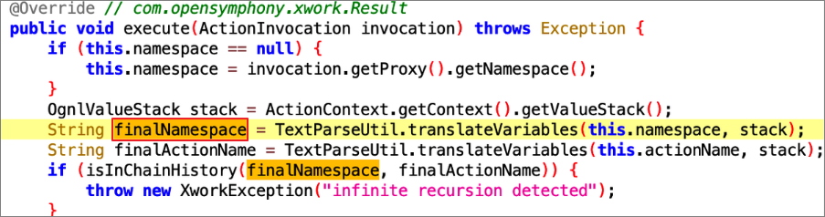 finalNamespace에 값을 저장할 때 TextParseUtil 에서 OGNL 표현식이 사용되었음을 확인 할 수 있습니다.