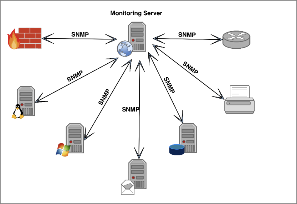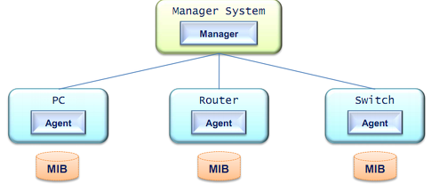 네트워크상의 자원들을 모니터링하고 제어하기 위한 도구로, 전체 시스템에서 관리하는 네트워크 요소의각 지점과 특정한 속성에 주소와 이름을 지정하고 주기적으로 각 요소가 가진 정보를 중앙 제어 센터에 제공하는 Manager-Agent 구조를 가지고 있다.