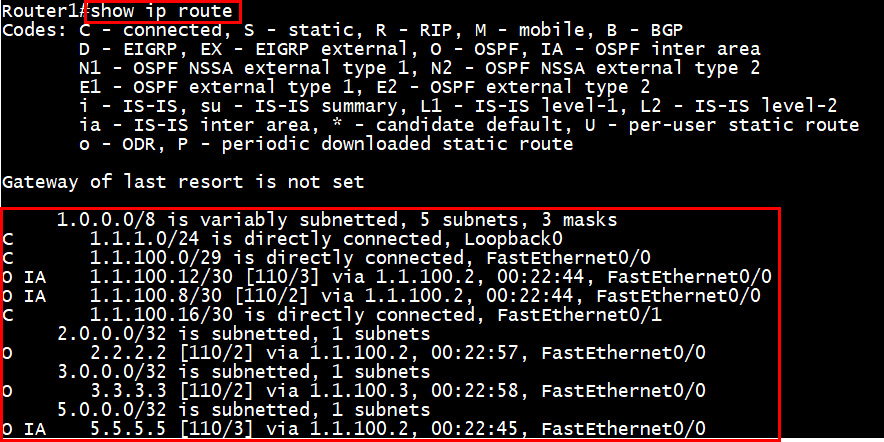 conf t router ospf 1 router-id 1.1.1.1 net 1.1.1.1 0.0.0.0 area 0 net 1.1.100.1 0.0.0.0 area 0 net 1.1.100.18 0.0.0.0 area 1 ! |