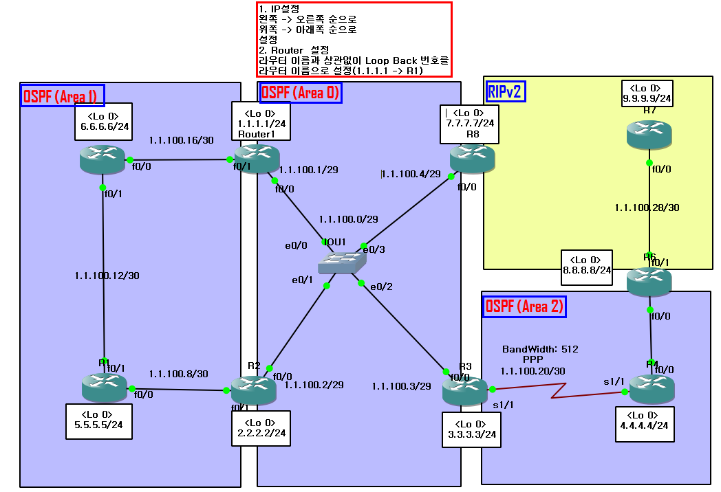 - R1, R2, R3, R7은 Area 0번에 속해 있는 Network이다.