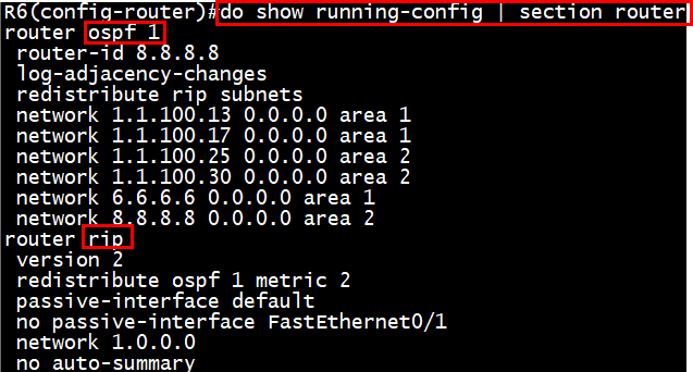 R6(config)#router rip R6(config-router)#redistribute ospf 1 metric 2 |