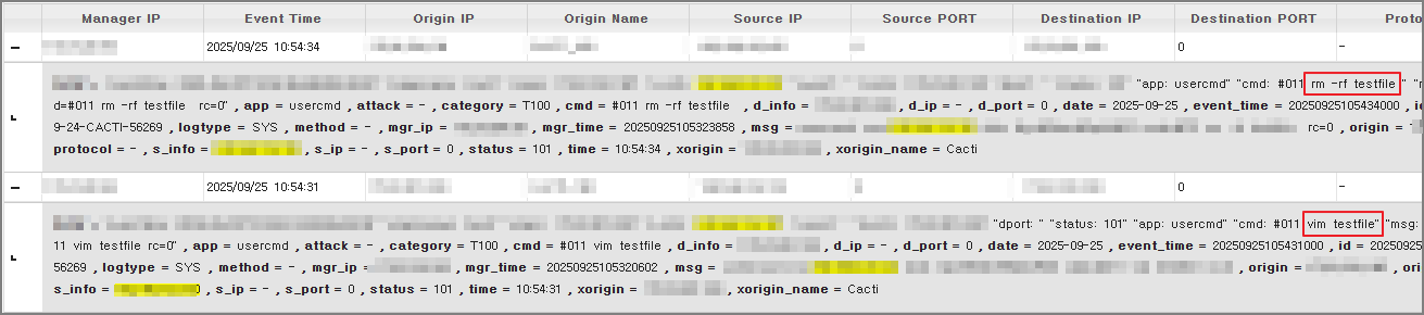 "eventtime: 2025-09-24T09:00:12+09:00" "originname: Server1" "origin: 192.168.0.1" "s_info: 192.168.0.100" "d_info: 192.168.0.1" "app: usercmd" "cmd: rm -rf aa" "msg: user=root src=192.168.0.100 dst=192.168.0.1 tty=pts/5 cmd=rm -rf aa"