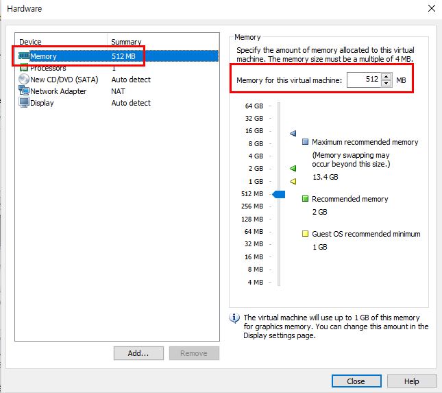 - 실습환경에서 메모리를 크게 사용할 일이 없으므로 512MB로 설정한다.