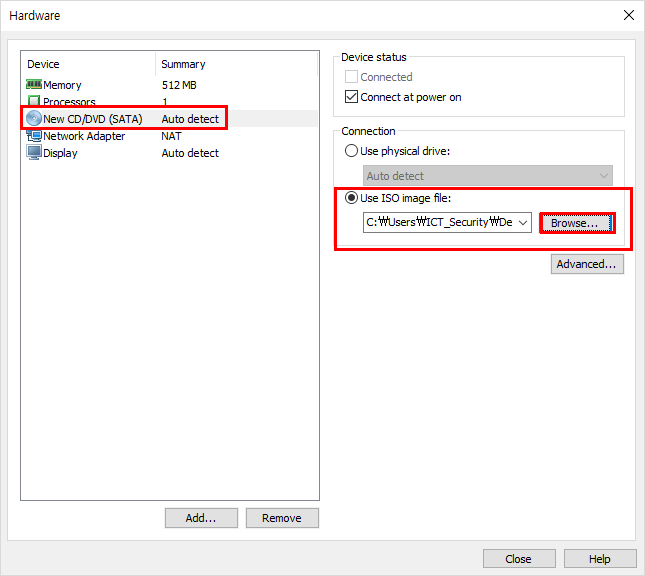 9. ISO Image를 넣기 위해 CD/DVD(SATA)에 Browser를 눌러서 ISO 이미지 삽입한다.