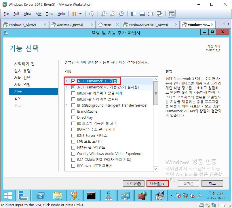 4. 기능 선택에서 .NET Framework 3.5 기능을 체크 후 다음 버튼을 누른다.