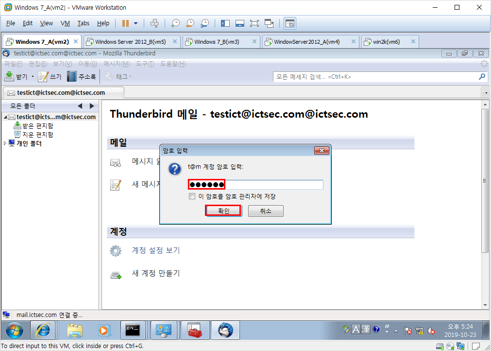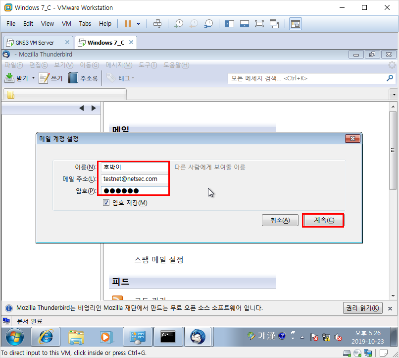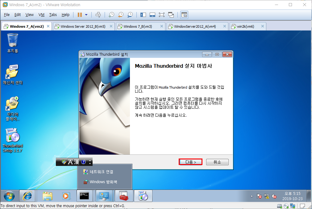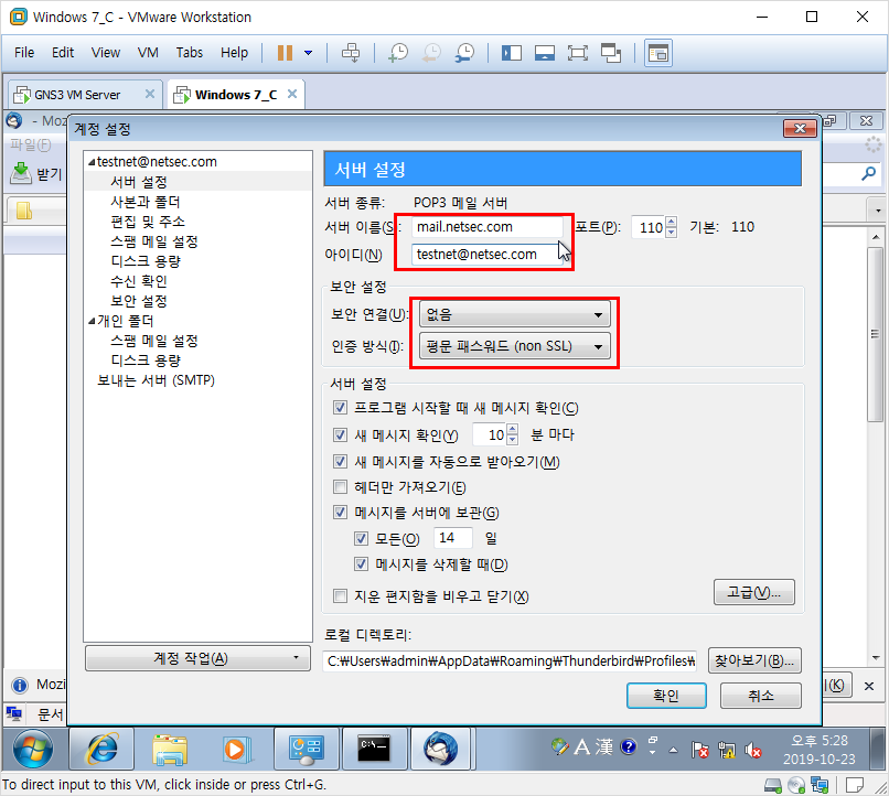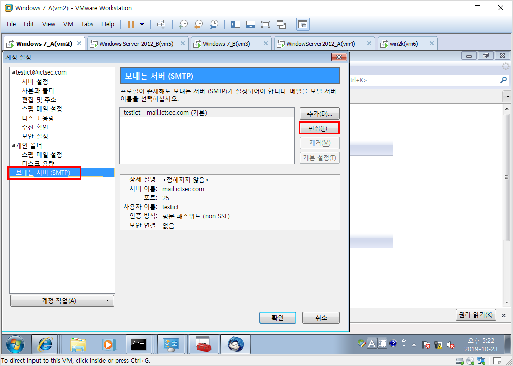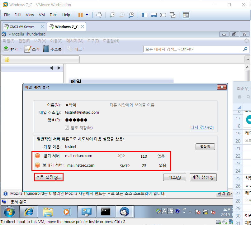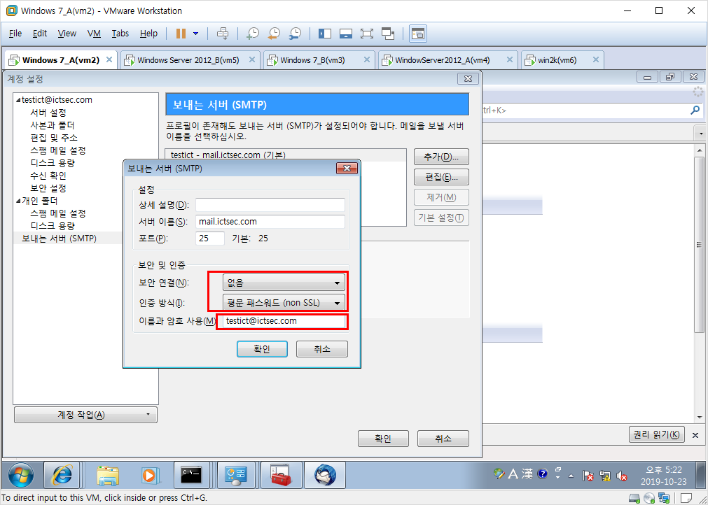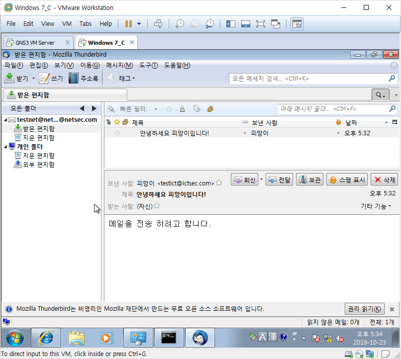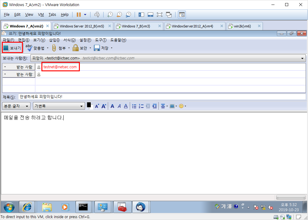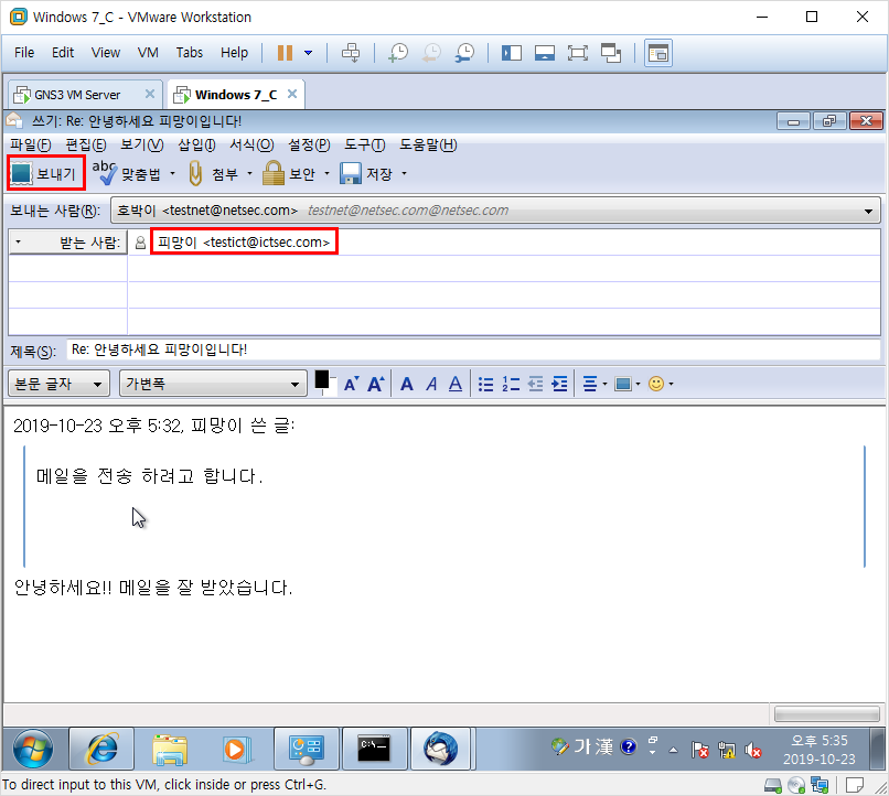 - VMnet2번 Window7 PC(1번 PC) 사용자가 다른 네트워크 대역인 VMnet9번 Window7 PC(2번 PC) 사용자에게 메일을 주고받으려고 한다.