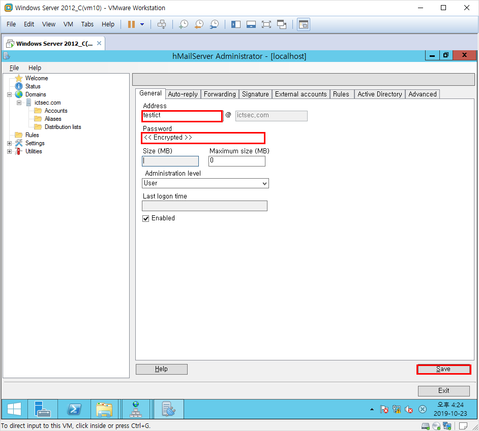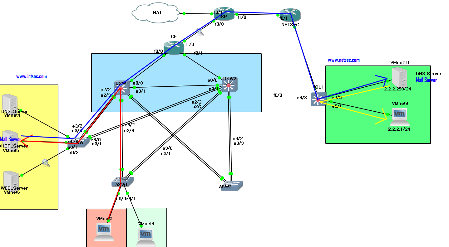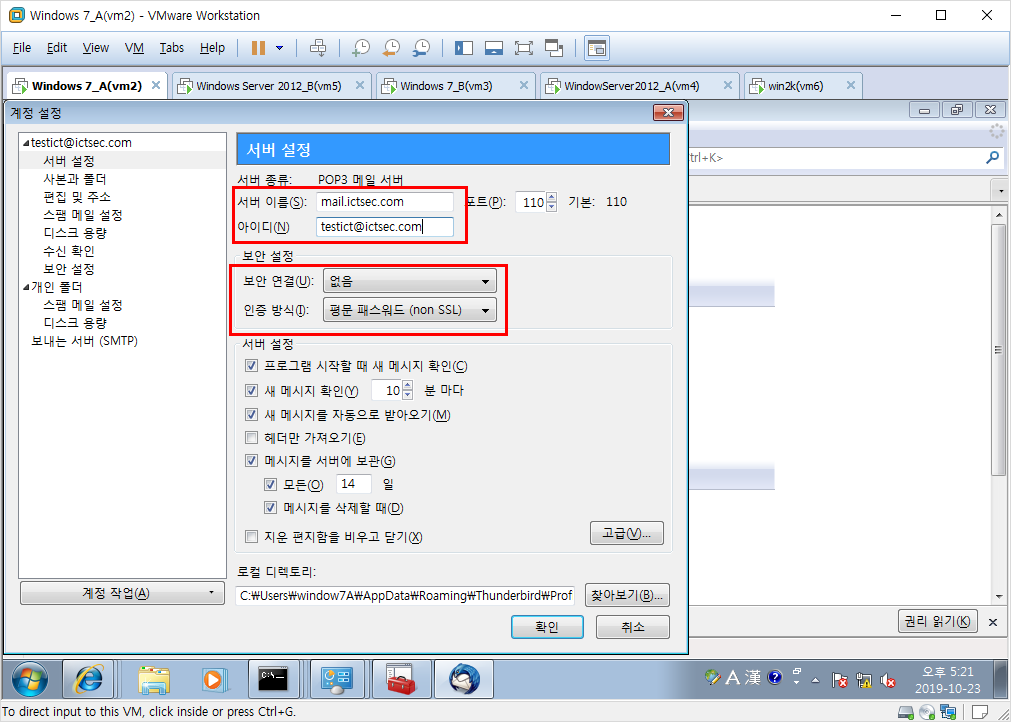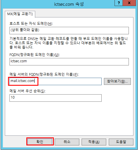 - 메일 서버 주소는 1번 PC대역은 www.ictsec.com이고 2번 PC대역은 www.netsec.com이다.