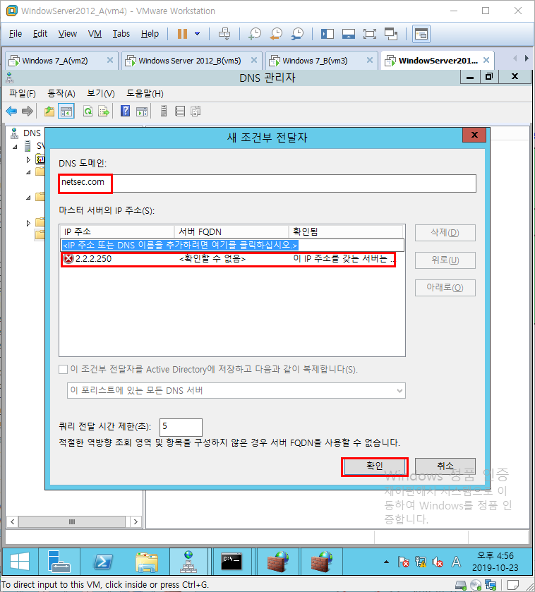 - 1번 PC의 DNS Server는 VMnet4번 Window2012 Server PC이고 Mail Server는 는 VMnet5번 Window20