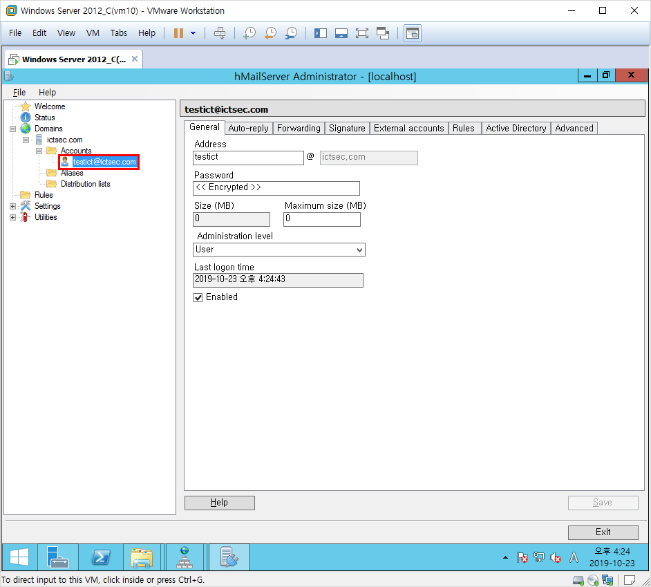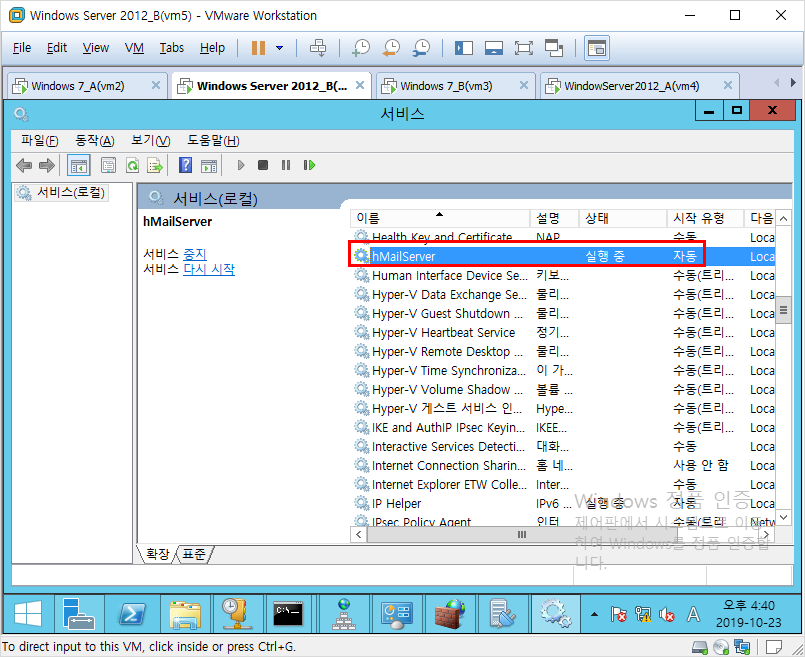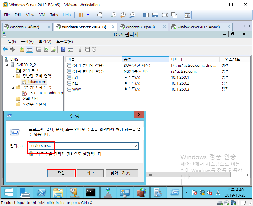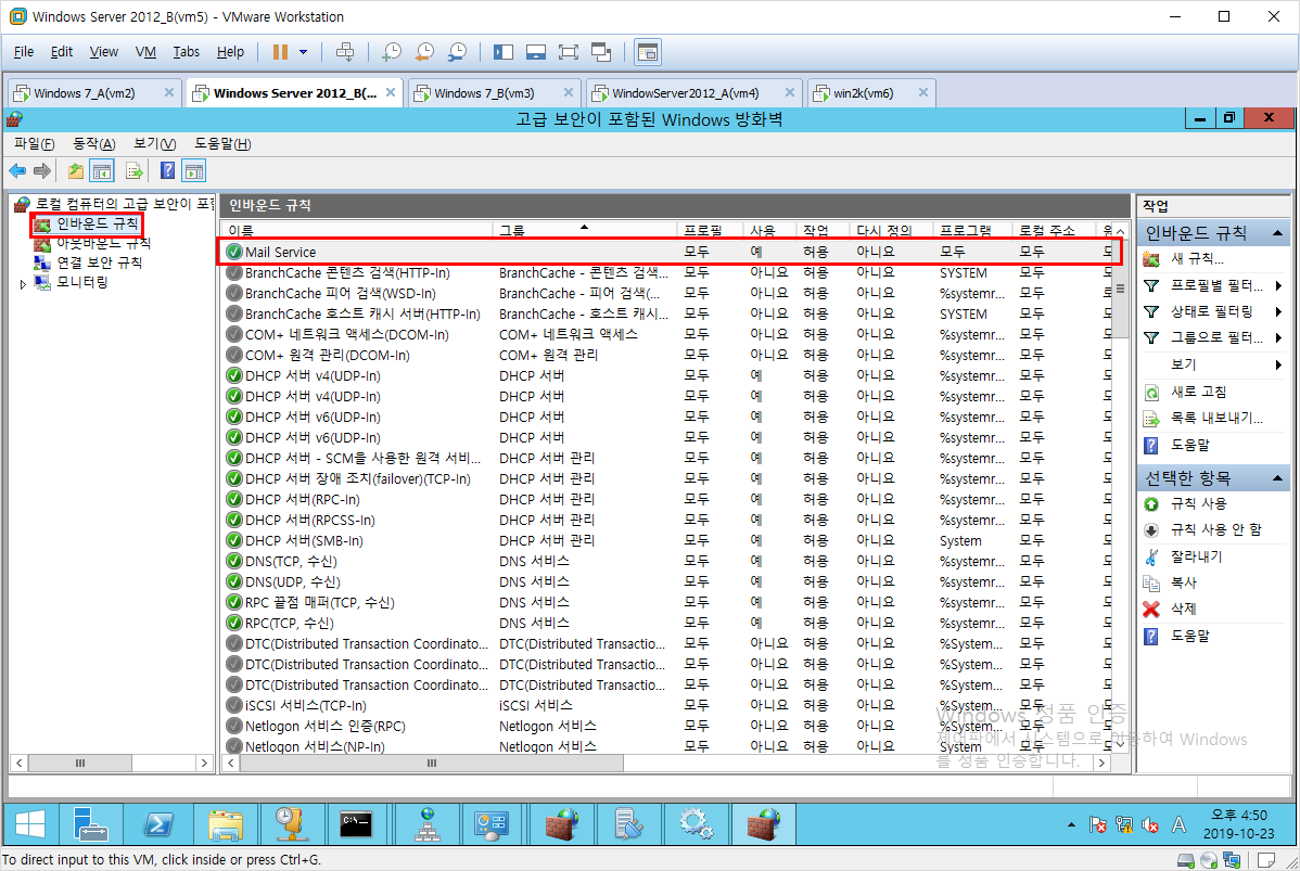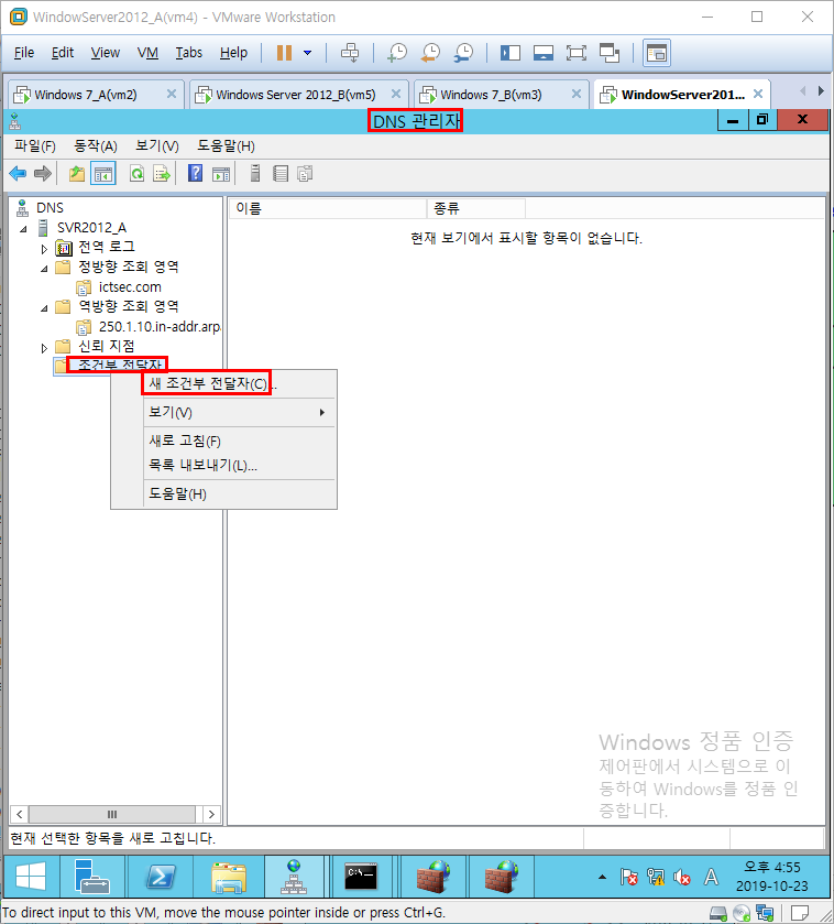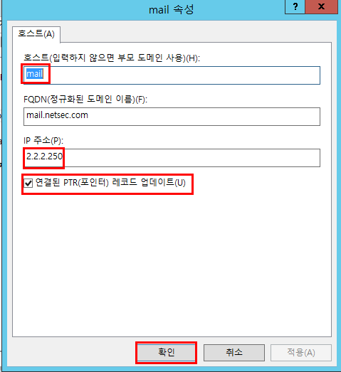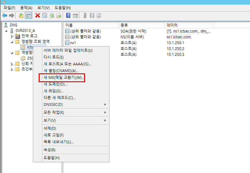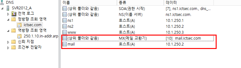 - 2번 PC는 DNS Server와 Mail Server를 동일한 서버인 VMnet10번 Window2012 Server PC에 구성하였다.