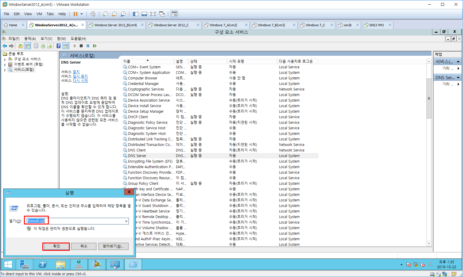 13. 방화벽에 들어가기 위해 firewall.cpl명령어를 이용하여 방화벽에 접속한다.