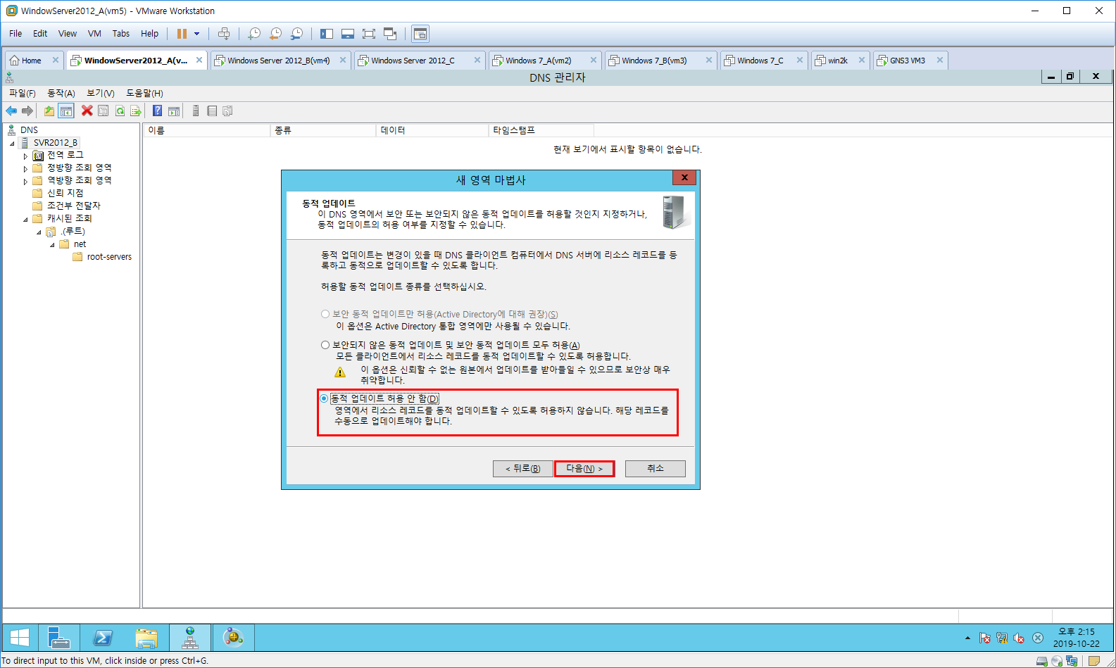 7. 동적 업데이트 허용 안 함을 체크한 후 다음 버튼을 클릭한다.