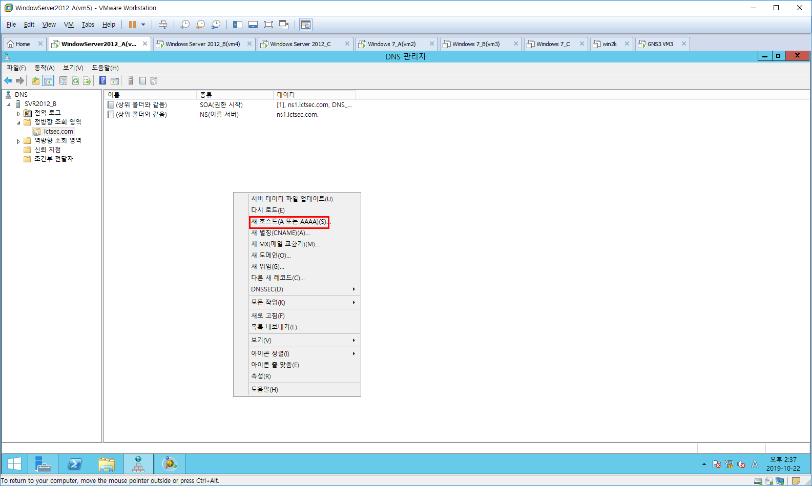 17. www.ictsec.com 을 등록하기 위해 마우스 우 클릭 후 새호스트를 클릭한다.