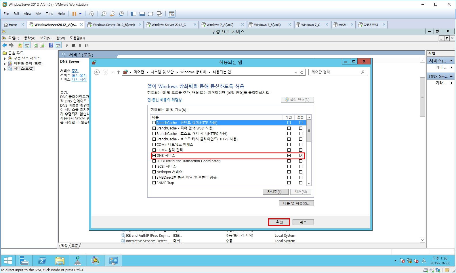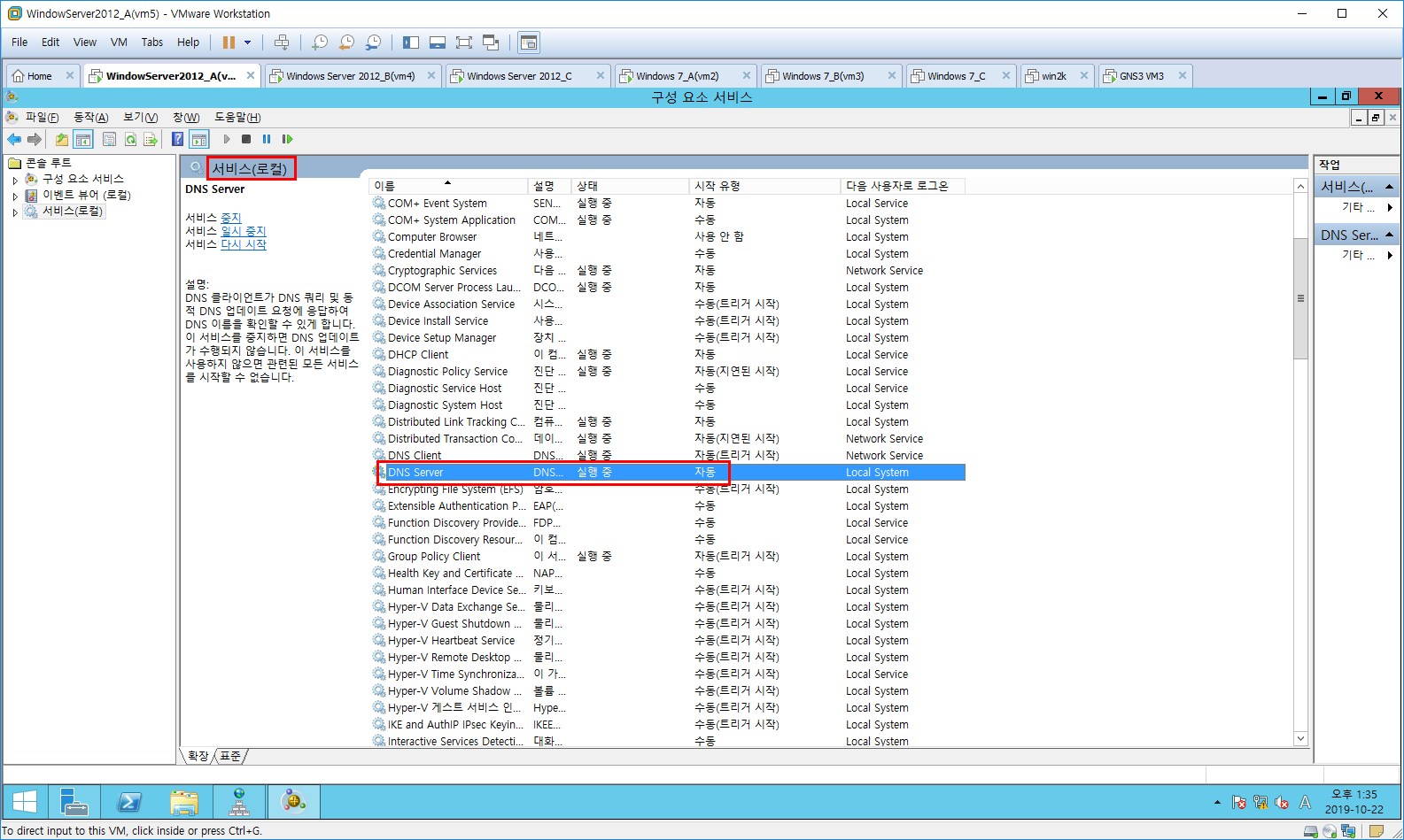 12. DNS가 동작하는지 확인하기 위해 서비스에서 DNS Server가 잘 동작하는지 확인한 후 부팅시 자동으로 실행되게 설정한다.