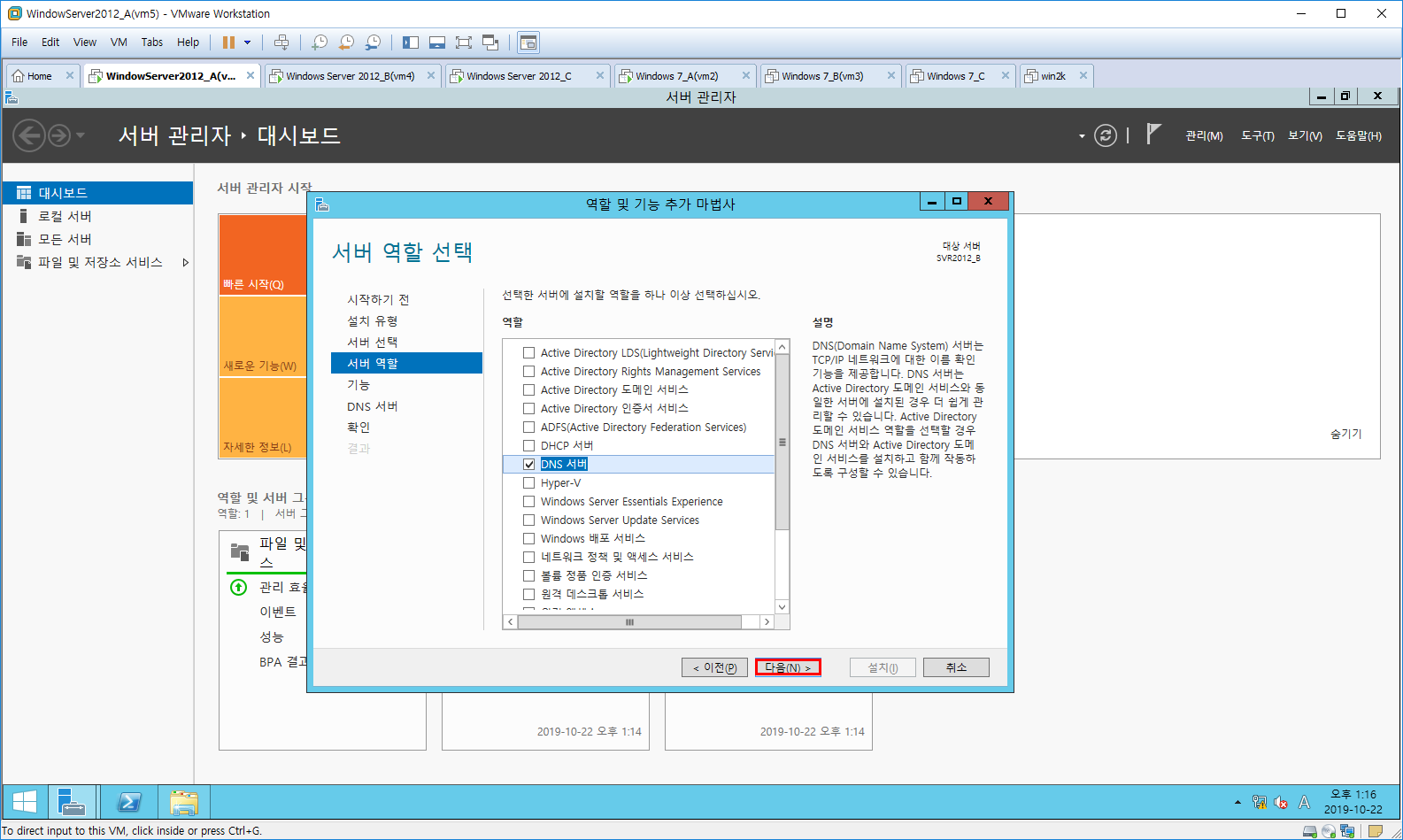 5. 서버 역할에서 DNS 서버를 체크한 후 다음 버튼을 클릭한다.