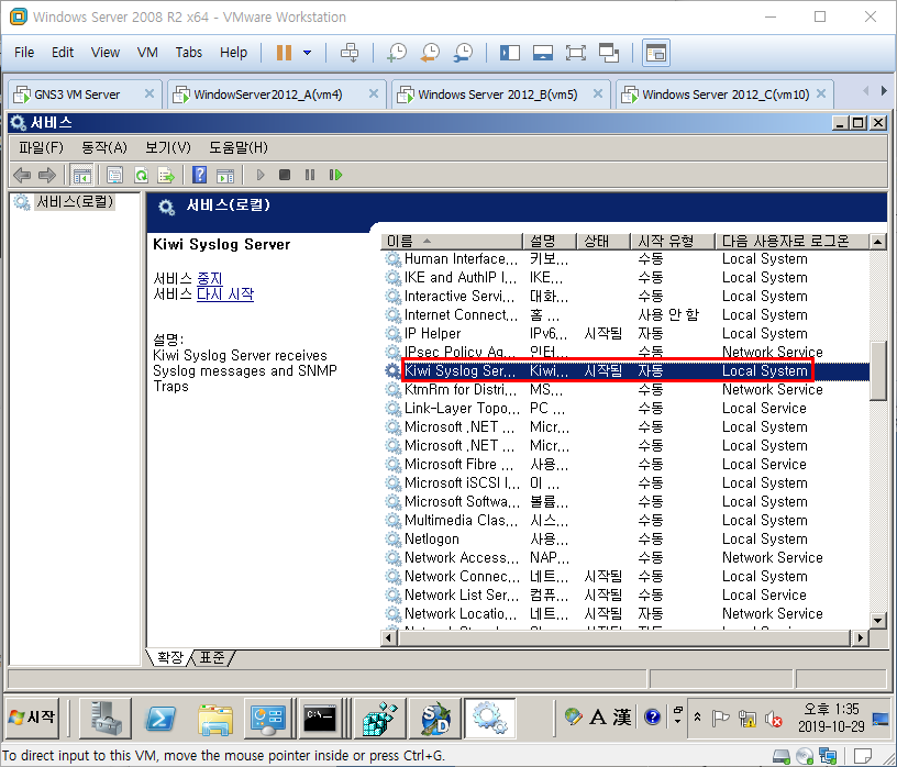 2. 서비스에서 Kiwi Syslog Service가 실행되고 있는지 확인한다.