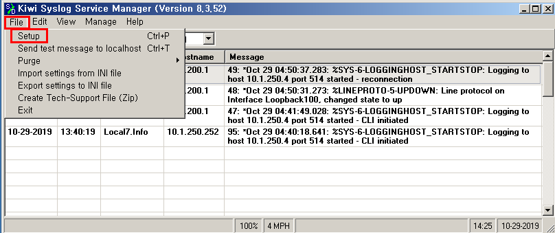 1. Kiwi Syslog에서 File 에서 Setup을 클릭한다.